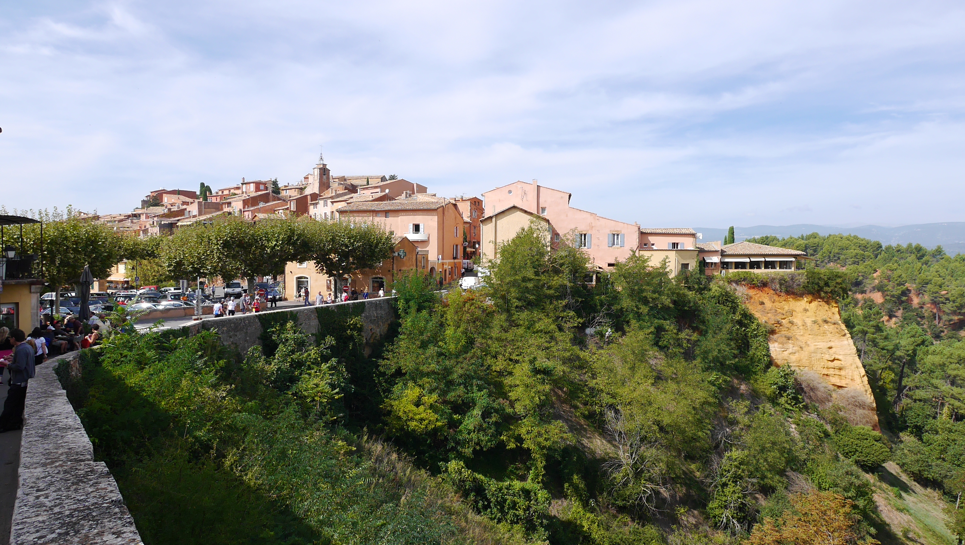 アヴィニヨンからバスで約1時間走って最初の訪問地ルシヨンに降りたら、思わず驚きが声に出てしまう。見渡す限り赤味がかった黄土色(赤さび色、赤銅色…とか実際の色の名を正確に当てはめるのは難しいが)一色である。古い時代よりルシヨンは、土壌全体に赤黄土色(オークル)の鉱脈が広く走っていることで有名で、何千年もの長きにわたって村を創り上げてきた人間の営みを感じる村である。現在の住民は1000名余だときくから、皆お互いに知り合いではないか。写真にあるように村の中心部は小高い丘になっていて、麓には日除けに数本の緑樹が植えられている小さな広場があった。なおガイドに教えて貰ったが、ルシヨン村からバスの定期便があって、1時間ほど南に下れば地中海の大きな港町「マルセーユ」に着くという。そういえばプロヴァンスは、歌の通り「海と陸」とセットで住みたくなる地方なのである。