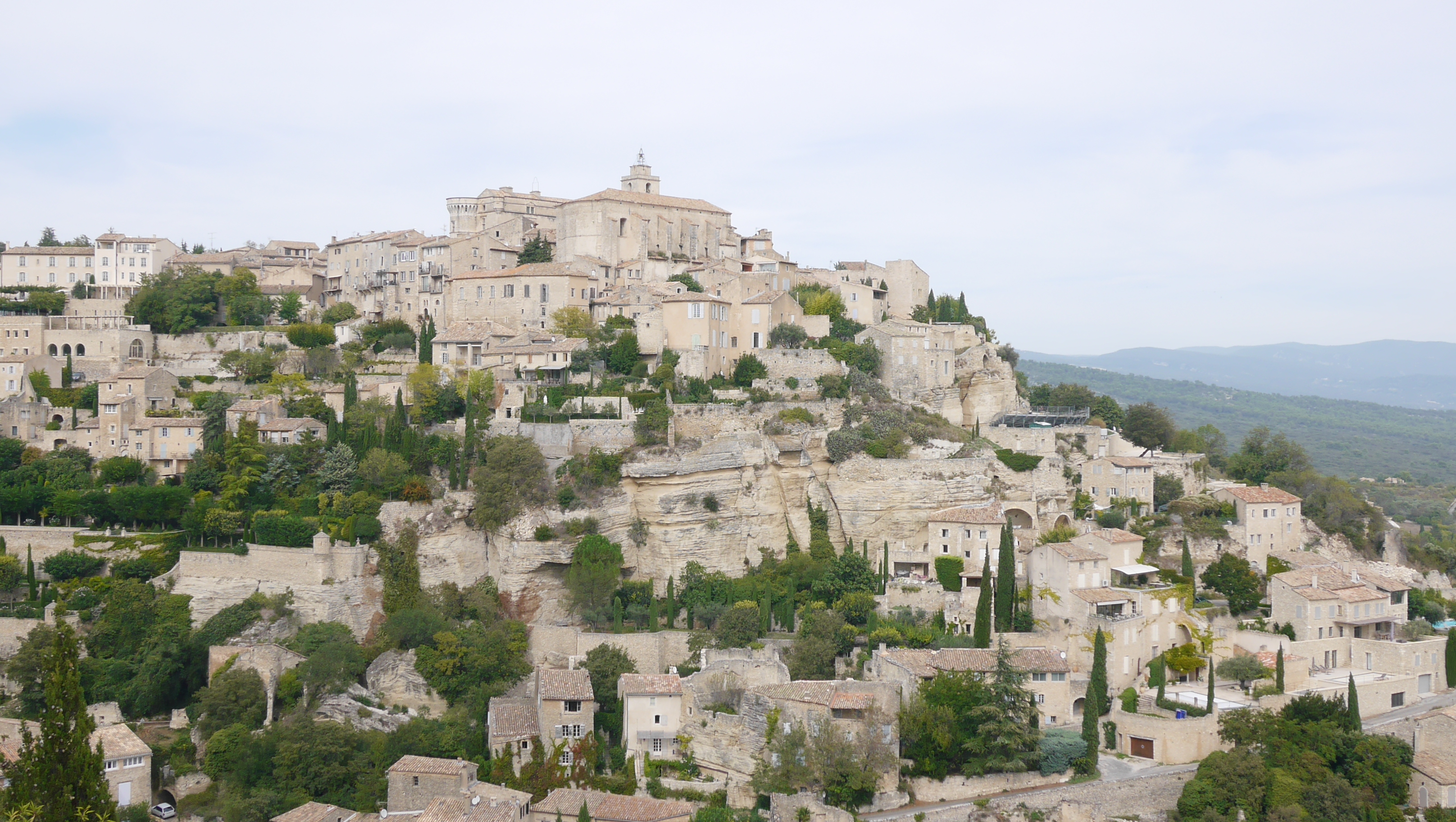 ゴルドは村の中の様子と少し離れたて観た外観の写真2枚を載せる。最初に訪れたルシヨンから少しアヴィニヨン寄り(即ち西方向)に戻ればゴルドである。綺麗なプロヴァンスの2つの村が隣接している地域なので移動のバスの車窓も美しい。ルシヨンより少し広目の村の中心の公園には、噴水を携えた教会が建っていて、幾度も映画のロケ地に使われたり、フランスで一番美しい村に推薦されたりしているのが実感できた。村には2000年も昔、ローマ軍の侵攻を防いだ遺跡があったりして、歴史のある町はやはり歩いていていろいろな感慨も深まる。ただゴルドに関しては、車で10分ほど走ったところにある場所から見る村全体の姿も素晴らしく、「鷹ノ巣村」と呼ばれる由縁である。なお一見物静かなゴルド村の全景写真とは裏腹に、撮影展望所が特設してあるわけでないので、その狭い場所は観光客と車でごった返していてシャッターを切るのにも大変危険な場所であった。僕も危ない目に合った、というよりドライバーに仏語で何度も怒鳴られて、少なくとも落ち着いた状態で撮影できなかった。高齢観光客には危ない絶景ポイントといえる。